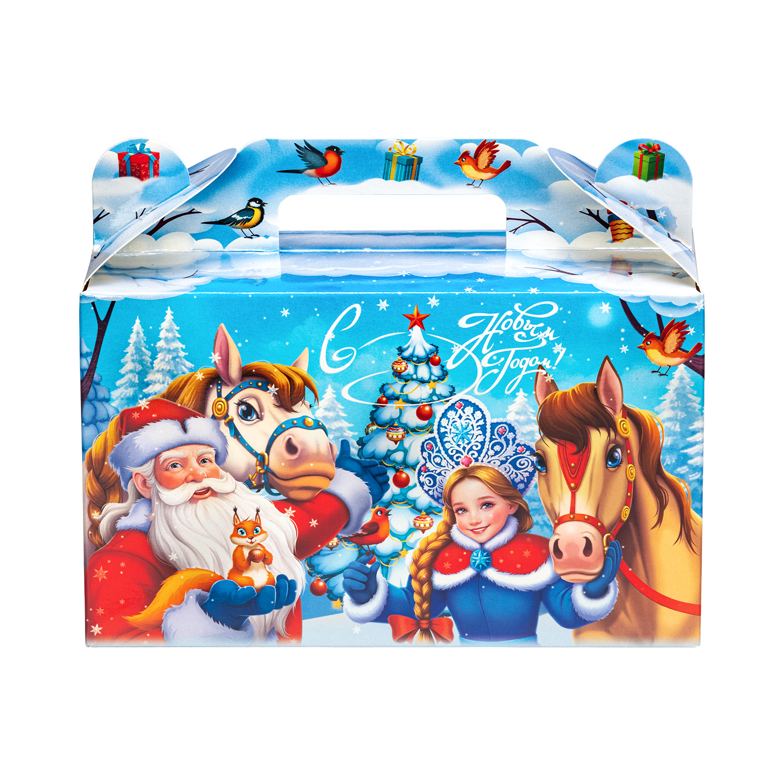 Новогодний сладкий подарок должен быть не только вкусным, но и привлекательным. Именно таким и является подарочный набор “Дружная команда”! Это компактный подарок в традиционной картонной упаковке в форме небольшого чемоданчика. На нежно-голубом фоне изображена картина роскошного снежного леса. На передней части упаковки мы видим главных действующих лиц - Дедушку Мороза, Снегурочку, грациозных лошадок и парочку лесных зверят. Вся дружная компания приветливо смотрит на нас и приглашает присоединиться к праздничному чаепитию с вкусными сладостями, которые бережно хранятся в этом замечательном чудо-сундучке.
