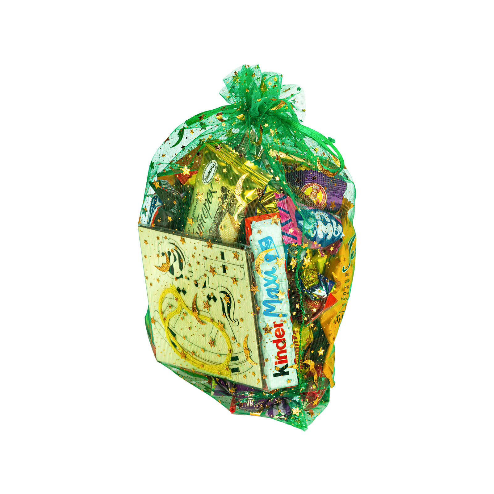 Новогодние сладкие подарки в текстильном мешочке - универсальный выбор, если речь идет о новогоднем празднике в школе или детском саду. “Лунная ночь” - это компактный бюджетный подарочный набор, упакованный в зеленый текстильный мешочек, сверху надежно перевязанный веревочкой. В состав подарка входит входит 500 грамм разнообразных кондитерских изделий на любой вкус: желе, бисквиты, батончки, шоколадные конфеты и многое другое. Также в мешочке можно найти небольшой памятный сувенир в виде символа наступающего года - очаровательной грациозной лошадки.