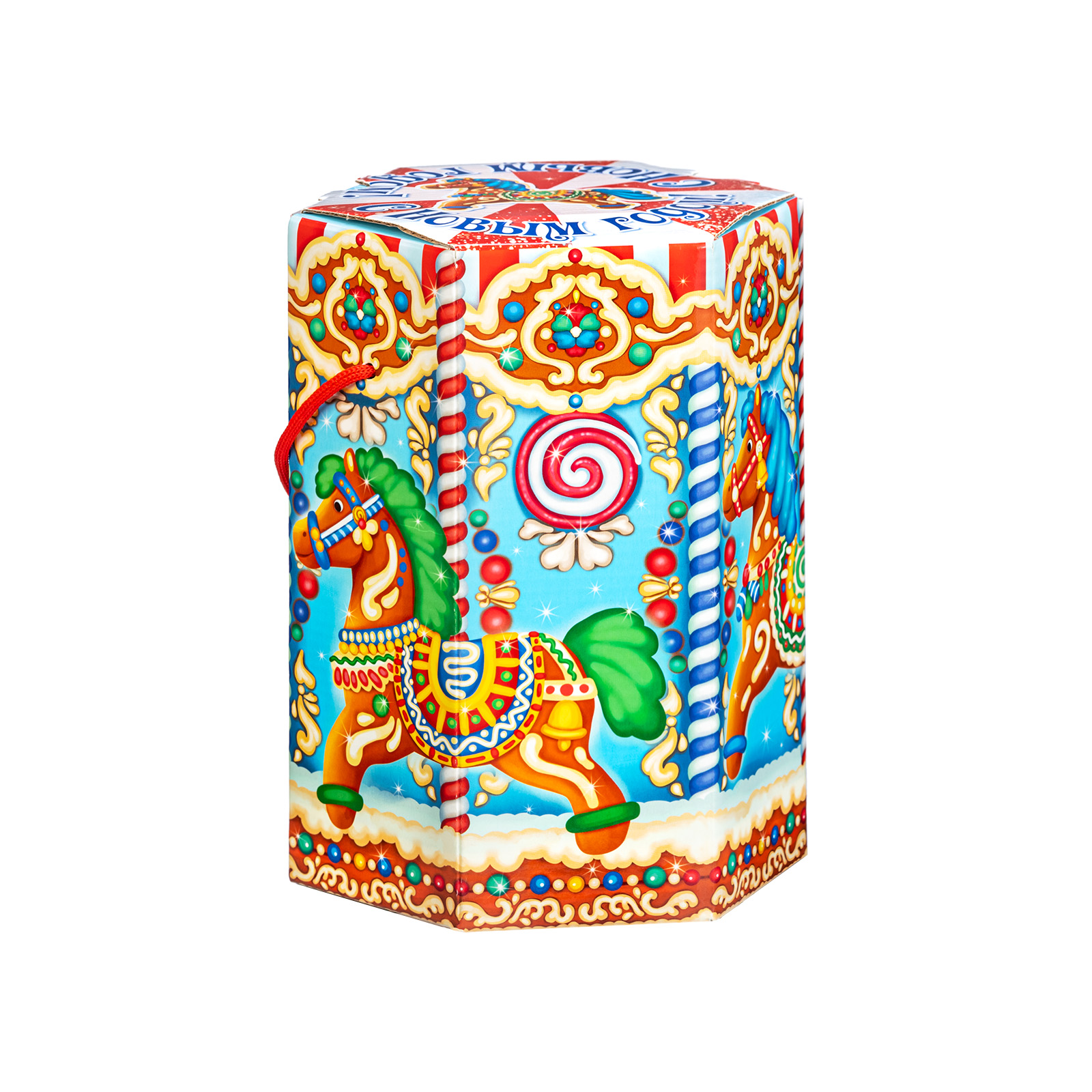 Интересный вариант новогоднего подарка – «Пряничная карусель». Он представлен в разделе Картон. Отлично подойдет на подарок в 2026 году с символом Лошадь. Внутри такого презента находится кондитерский набор весом 800 граммов.